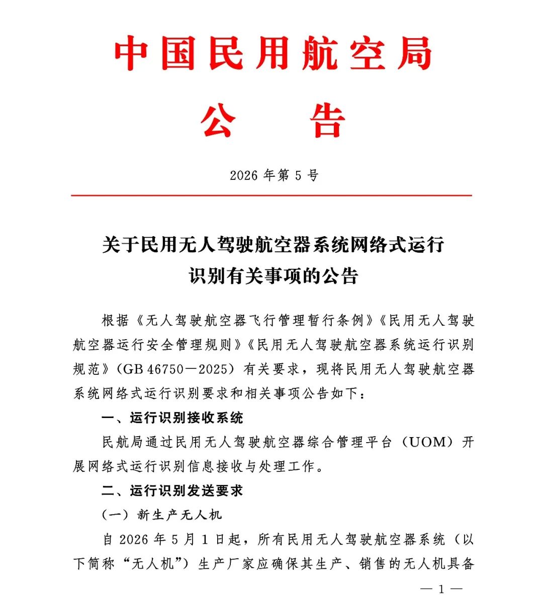 2026年5月1日起,全国将正式实施两项无人机强制性国家标准:《民用无人驾驶航空器实名登记和激活要求》(GB 46749-2025)与《民用无人驾驶航空器系统运行识别规范》(GB 46750-2025)。这是无人机安全监管的全面升级,核心是全量实名、全程识别、实时报备,从源头和飞行全流程实现一机一码、全程可管、可追溯。