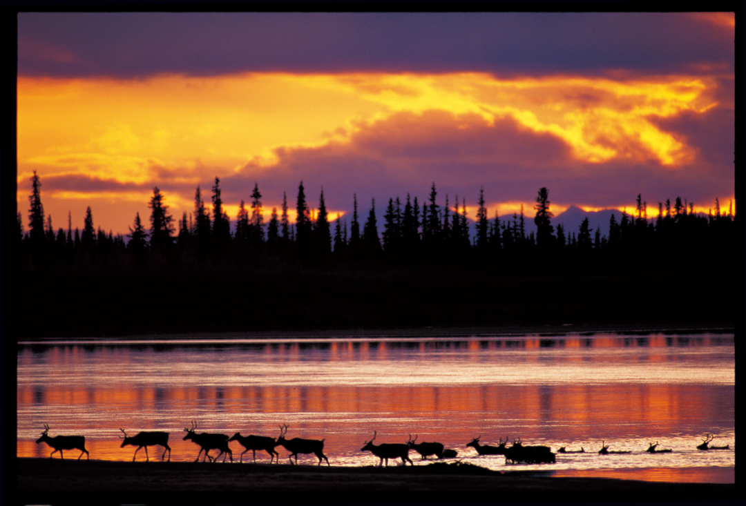 金色的火烧云下,成群的驯鹿涉过湍急的空卡库特河,座头鲸从平静的海面飞跃而出;