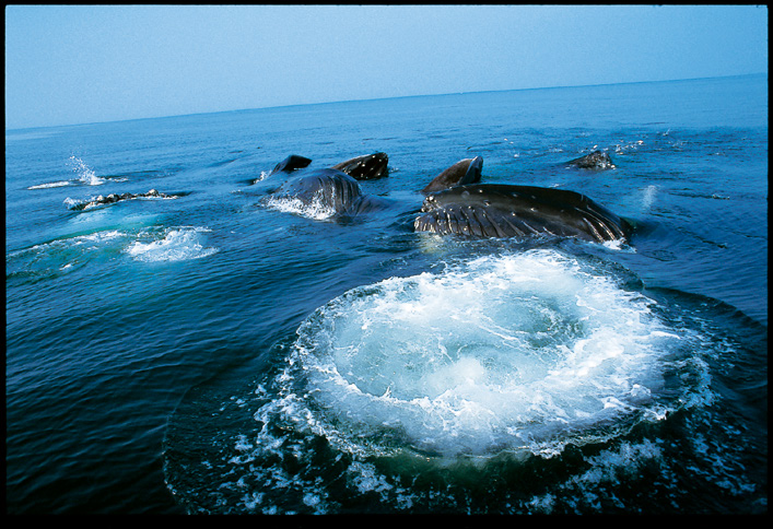 不一会儿,那五头座头鲸竟然避开了圆形气泡,若无其事地缓缓浮现在海面上。刚刚一定发生了什么事,就在它们跃出海面的前一刻,我知道一定发生了什么事。我不禁松了一口气,望着眼前正在喷气的巨大生物。