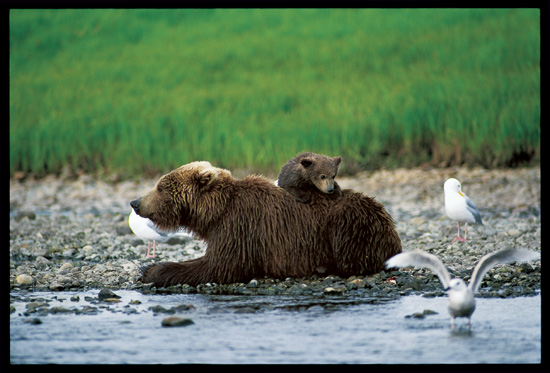看到如此温馨的场面,内心不免对于灰熊过去遭受的悲惨历史感到鼻酸。白人开垦美国的过程可说是一部灰熊的虐杀史,由于人们惧怕灰熊,将其贴上凶猛动物的标签,毫不留情地大开杀戒,阿拉斯加已成为灰熊目前生存的最后一块净土。