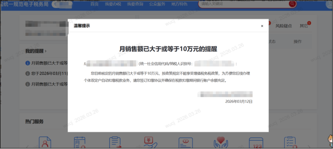 纳税人办理“定期定额核定及调整定额”业务时,若“月应纳税经营额”的合计值大于等于10万元,系统增加消息提醒和短信提醒。