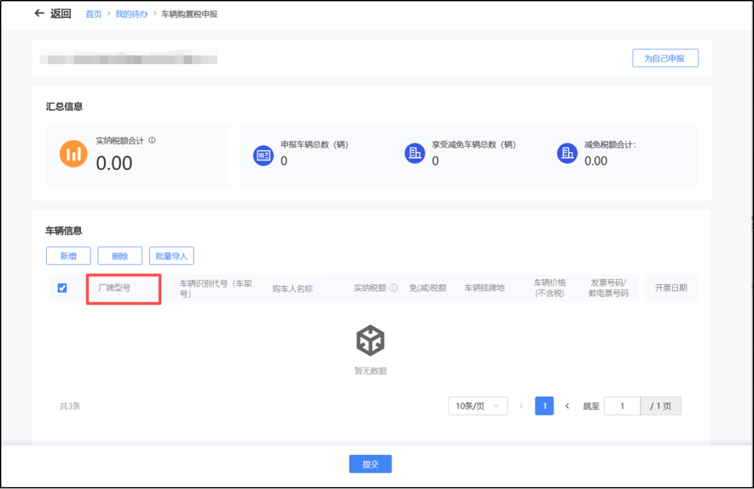 登录山东省电子税务局,通过【我要办税】-【税费申报及缴纳】-【综合申报】-【车辆购置税纳税申报】进入功能,在申报页面,“车辆型号”调整为“厂牌型号”,如下图所示: