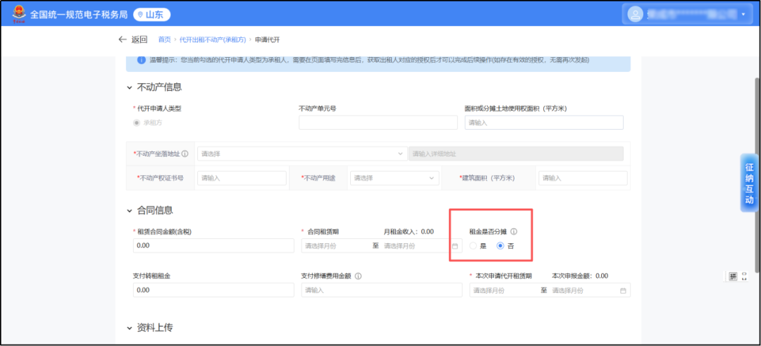 以企业身份登录山东省电子税务局,通过【我要办税】-【发票代开】-【代开出租不动产(承租方)】进入功能,点击“申请代开”按钮申请代开,查看页面中租金收入是否分摊按钮,允许手动修改,如下图所示: