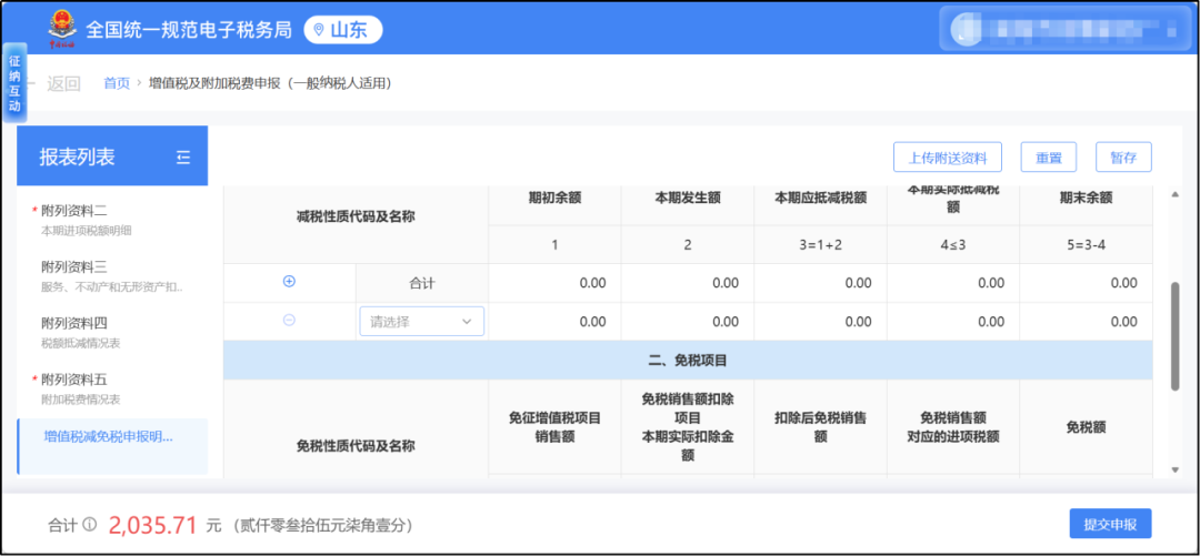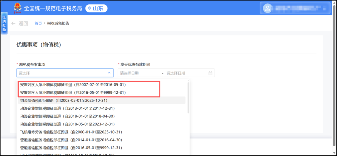 登录山东省电子税务局,通过【我要办税】-【税收减免】-【税收减免报告】进入功能,当“减免税备案事项”选择“安置残疾人就业增值税即征即退”,如下图所示: