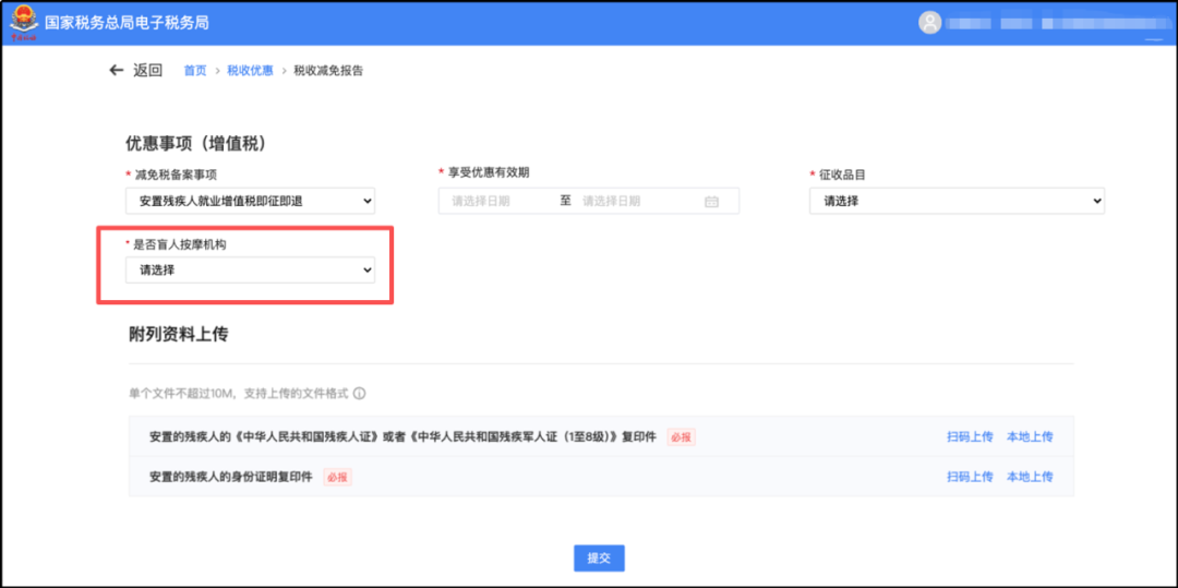 税收减免报告税收优惠事项选择“安置残疾人就业增值税即征即退”时,新增“是否盲人按摩机构”选项。