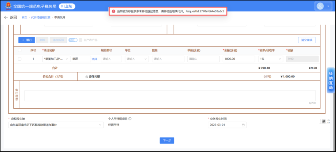登录山东省电子税务局,通过【我要办税】-【发票业务】-【代开增值税发票】进入功能,点击“货物、服务等一般代开”按钮申请代开,填写购买方信息,填写项目名称及金额,点击下一步按钮,如存在多条登记信息,则弹出提示:“当前销方存在多条未并档登记信息,请并档后继续代开。”