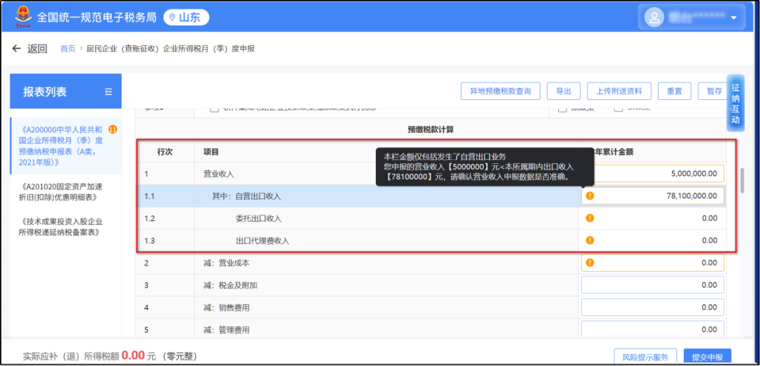登录山东省电子税务局,通过【我要办税】-【税费申报及缴纳】-【企业所得税申报】-【企业所得税(查账征收)月(季)度预缴申报表(A类)】进入功能,在申报页面填写《A200000 中华人民共和国企业所得税月(季)度预缴纳税申报表(A类)》营业收入及1.1自营出口收入、1.2委托出口收入、1.3出口代理费收入后,如营业收入项小于出口收入三项合计时,系统有提醒信息,请检查填写的数据是否准确。