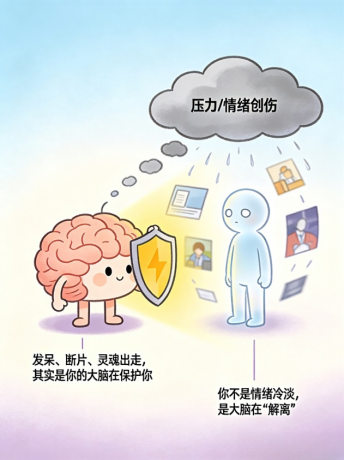 2.中度解离:核心是“感知断裂”,要么觉得时间变慢、停滞,对熟悉的环境突然感到陌生;要么在重大情绪事件中失去情感感知,像小A这样,亲人离世却哭不出来,心里麻木无波澜,事后往往会因为自己的“异常反应”感到困惑、愧疚。