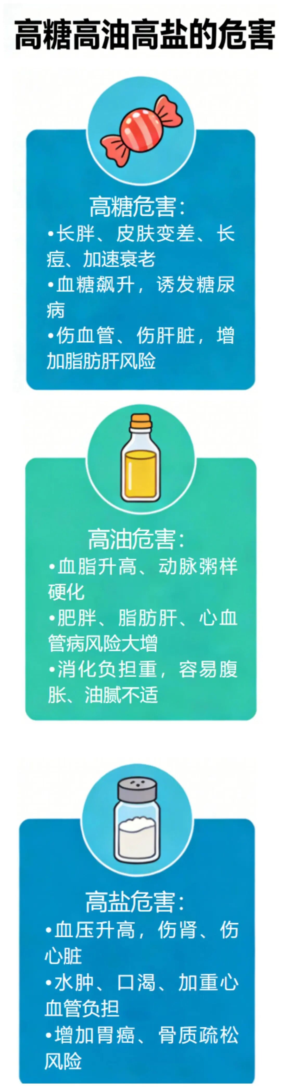长期高糖高油高盐=胖、病、老得快,是高血压、糖尿病、心脑血管病的主要诱因。