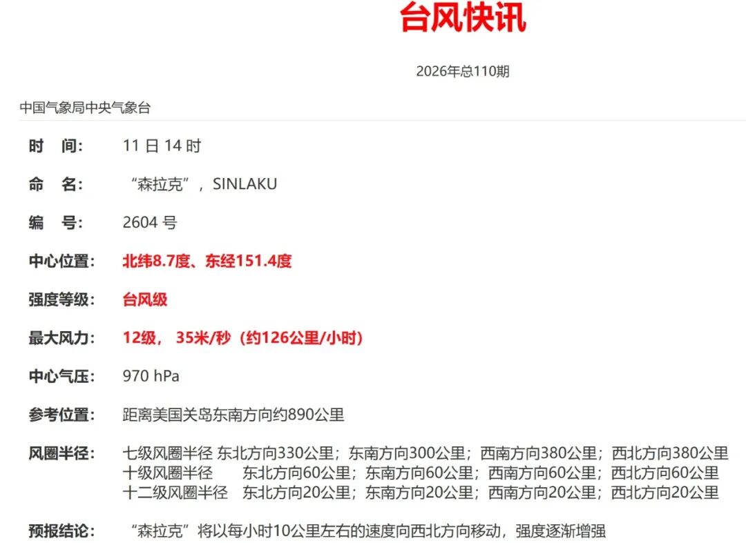 预计,“森拉克”将向西北方向移动,强度继续加强,14日凌晨逐渐靠近美国关岛附近洋面,预计最强可达超强台风级(55—60米/秒,16—17级)。未来“森拉克”对我国近海无影响。