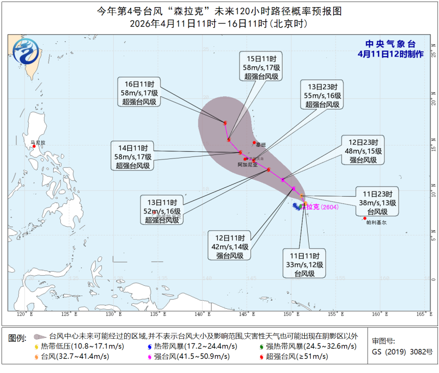 今年第4号台风“森拉克”已于今天(11日)上午由强热带风暴级加强为台风级,中心附近最大风力有12级(33米/秒),中心最低气压为975百帕,七级风圈半径为300—380公里,十级风圈半径为60公里。