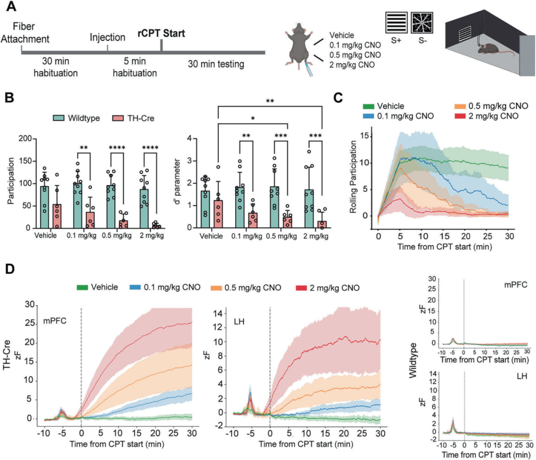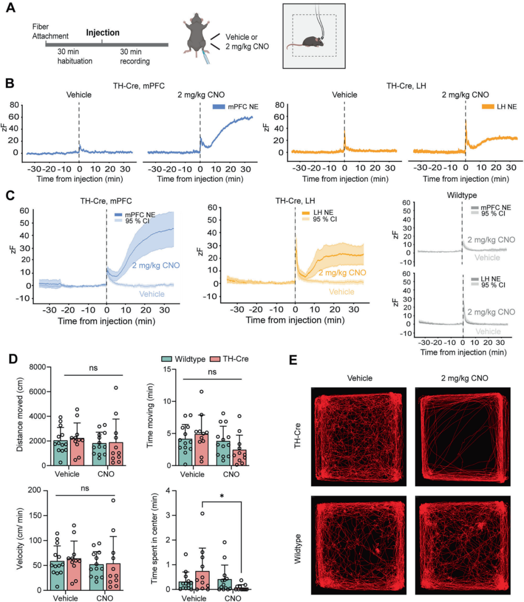 小鼠在适应旷场时,内侧前额叶皮层和外侧下丘脑的去甲肾上腺素荧光信号稳定。注射 CNO 后,去甲肾上腺素信号持续升高;注射溶剂或 CNO 时出现的短暂峰值,属于注射应激反应。只有激活 DREADD 的小鼠,信号会持续上升;野生型小鼠和溶剂组则很快回到基线。因为脑区、光纤位置、组织存在细微差异,无法精确对比不同小鼠/脑区的信号强度。