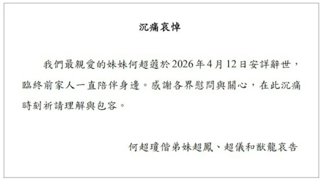 4月12日,何超琼、何超凤、何超仪、何超龙发布公开讣告,宣告姊妹何超蕸于4月12日在香港去世。 何超蕸出生于1966年,为赌王何鸿燊与二太太蓝琼缨所生第三个女儿,此前任信德集团有限公司执行董事及薪酬委员会成员,曾参与信德集团横琴口岸商务中心项目,推动粤港澳大湾区城市合作。