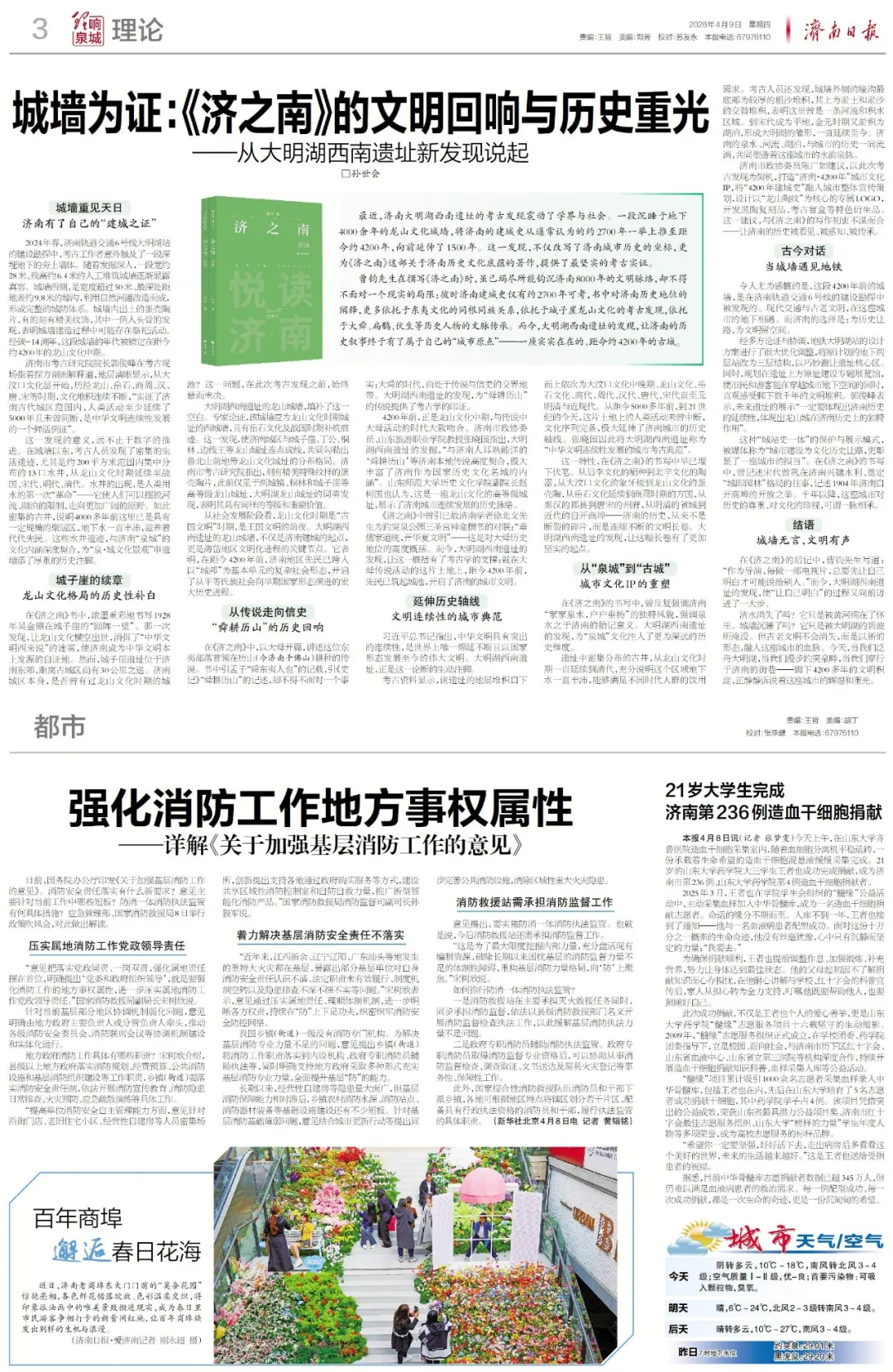 曹钧先生在撰写《济之南》时,虽已竭尽所能钩沉济南8000年的文明脉络,却不得不面对一个现实的局限:彼时济南建城史仅有约2700年可考,书中对济南历史地位的阐释,更多依托于东夷文化的同根同族关系,依托于城子崖龙山文化的考古发现,依托于大舜、扁鹊、伏生等历史人物的文脉传承。而今,大明湖西南遗址的发现,让济南的历史叙事终于有了属于自己的“城市原点”——一座实实在在的、距今约4200年的古城。