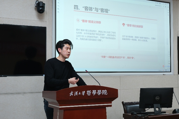 邹小舟博士分析了中国思想中的“客”,并由此讨论了中国传统认识论。邹老师指出,古代中国的“客”主要表达了事物的流动性、暂时性,用“客”来理解事物的认识方式实际上来自对视觉的质疑。这种在认识过程中对视觉的不信任实则是一种中西兼有的跨文化现象,中西认识传统对于视觉的克服采取了不同的路径,在传统中国思想中,将事物比喻为“客人”的理解方式,导向了一种整体主义的认识路径。随着现代“客体”“客观”概念的兴起,传统中以“客”喻物的理解方式几乎无容身之地,且现代汉语中将“客观”等同为“科学”的观念实际上造成了对于现代科学的粗糙认知。
