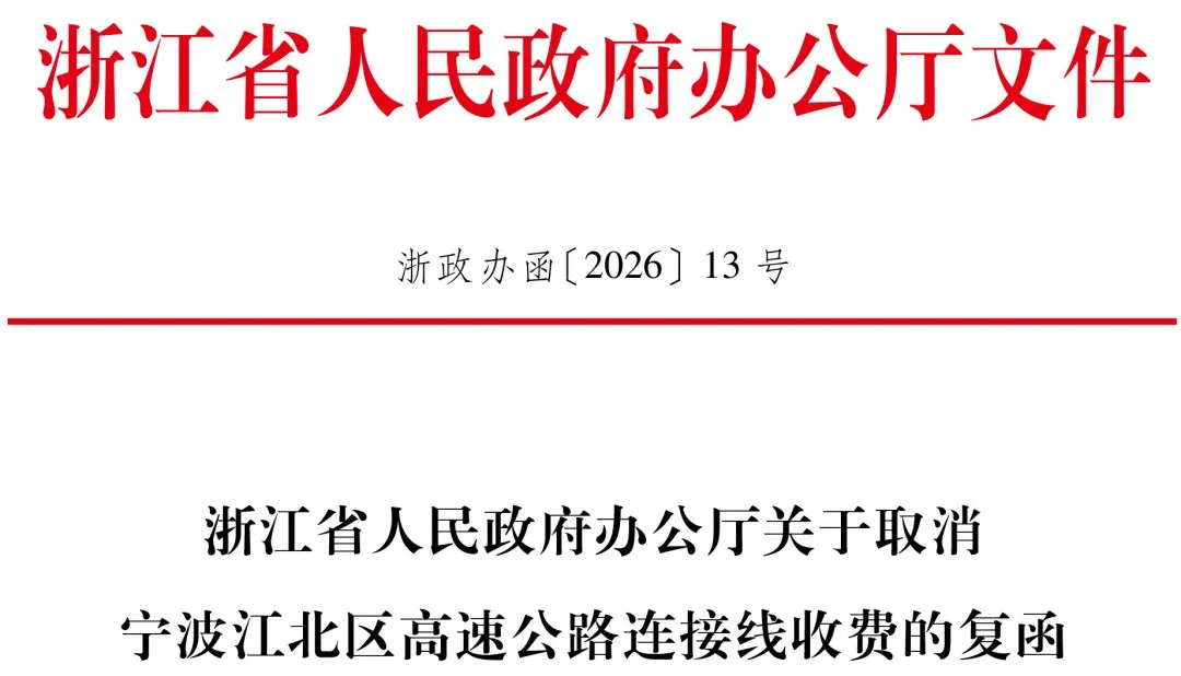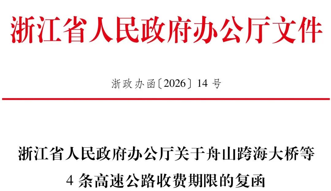 近日,浙江省政府办公厅针对《宁波市人民政府关于提前取消宁波市高速公路江北连接线收费项目并停止合并收费的请示》《浙江省交通投资集团有限公司关于核定舟山跨海大桥等高速公路收费期限的请示》进行复函↓↓