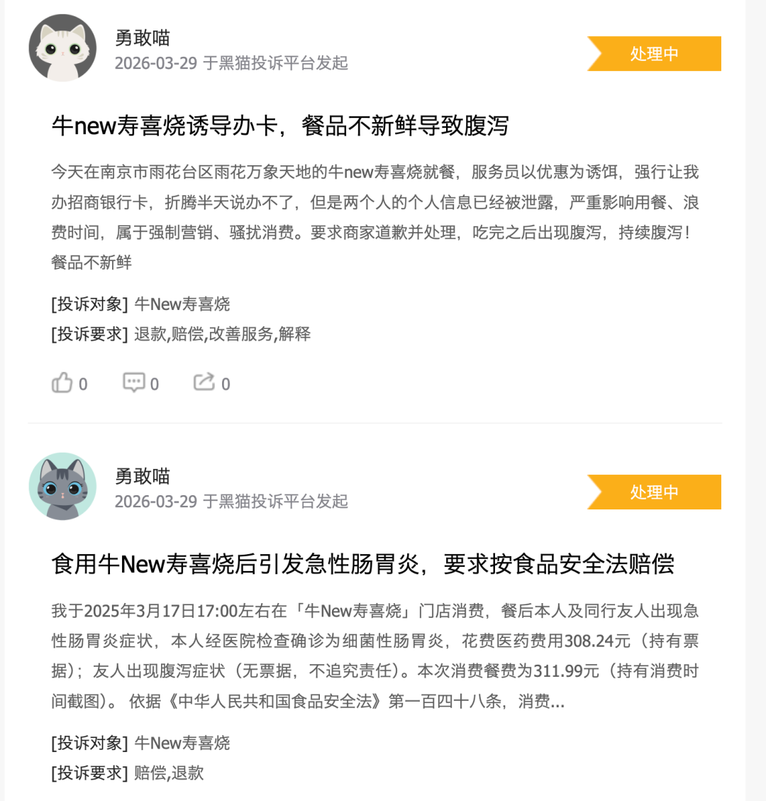 不过,加速扩张背后也存在一定隐患。在黑猫投诉平台上,相关投诉不在少数,大多集中在食品卫生等方面。对于一家以高品质为卖点的餐饮品牌而言,如何在扩张与品质之间保持平衡,还需要时间来检验。