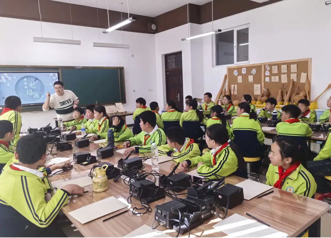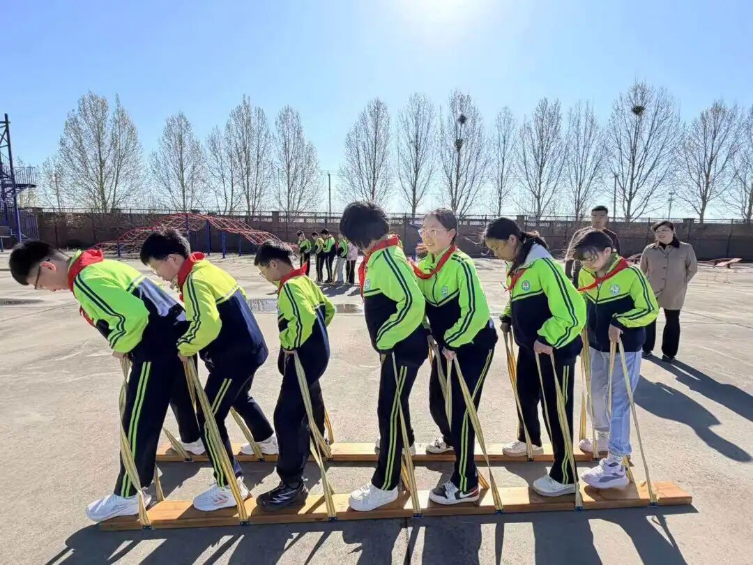 活动当天,150余名师生分为四组,同步开展不同主题的实践课程。在中药工坊,学生们认识艾叶、薄荷等中药材,了解香囊驱虫避疫的传统功效,亲手搭配药材、缝制香囊,在一针一线中感受中华传统文化的魅力。户外素质拓展区的“有轨电车”项目里,同学们脚踩木板、手牵拉绳,在“巨人脚步”的协作挑战中,深刻体会到团结一心、步调一致的重要性。雕刻书画教室中,电烙画课程让学生们体验传统工艺与现代技术的融合,在木板上勾勒创意图案;KEVA创意搭建室内,学生们运用积木条搭建各类造型,探索重心与承重的科学原理,在极限挑战中锻炼工程思维与创新能力。各组课程交叉进行,实现了文化传承、体能锻炼、艺术创作与科学探究的多元融合。