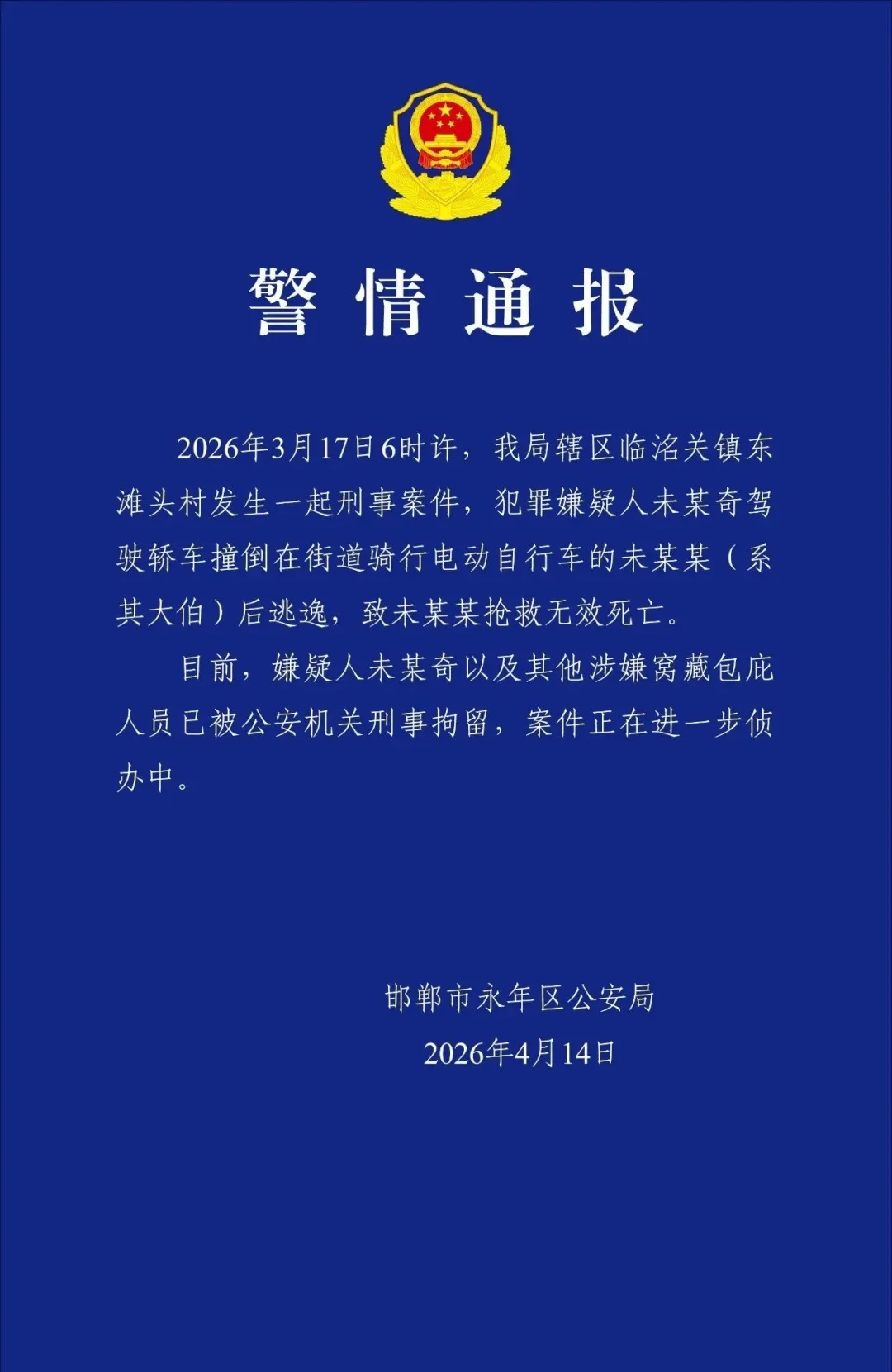 2026年3月17日6时许,我局辖区临洛关镇东滩头村发生一起刑事案件,犯罪嫌疑人未某奇驾驶轿车撞倒在街道骑行电动自行车的未某某(系其大伯)后逃逸,致未某某抢救无效死亡。目前,嫌疑人未某奇以及其他涉嫌窝藏包庇人员已被公安机关刑事拘留,案件正在进一步侦办中。