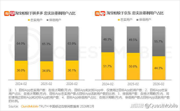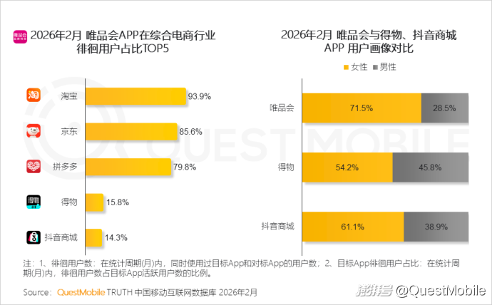 QuestMobile数据显示,截止2026年2月,唯品会与淘宝、京东、拼多多两两徘徊用户占比均在79%以上,表明其与头部TOP3APP形成了“共存”模式;与此同时,相较于得物、抖音商城,唯品会徘徊用户占比均在16%以内,突显其独特定位和差异化竞争优势。