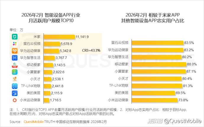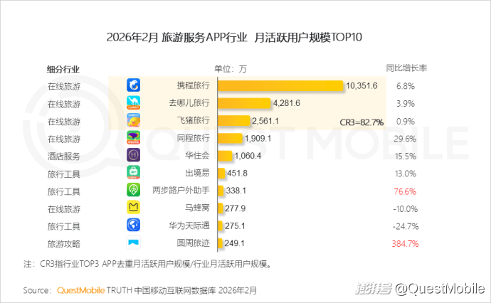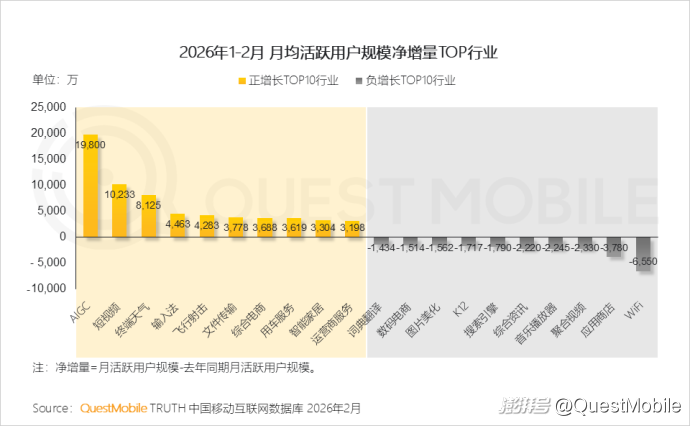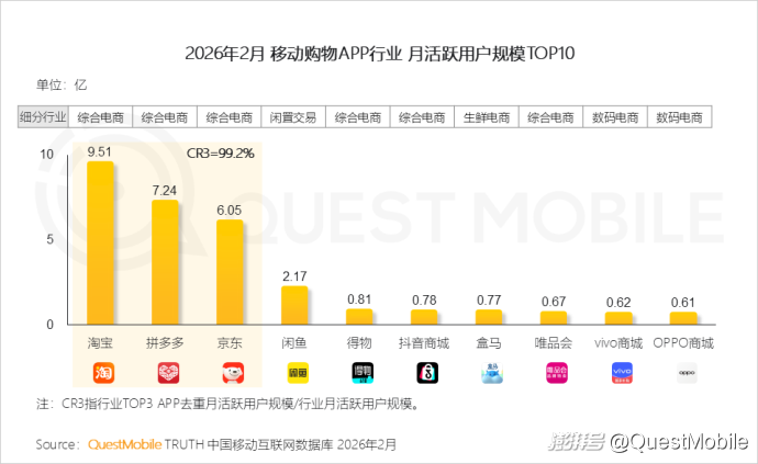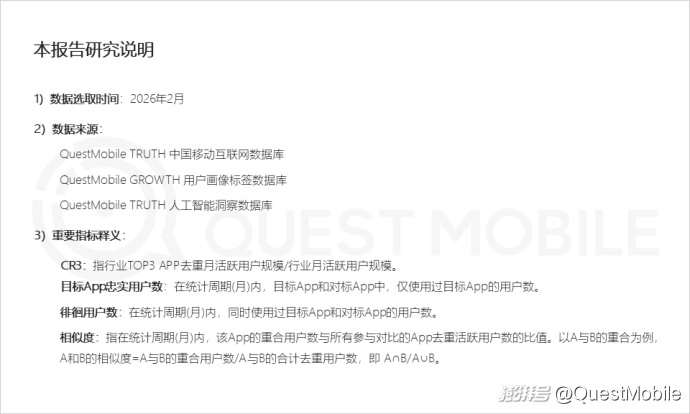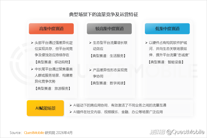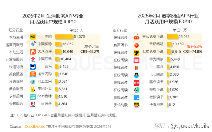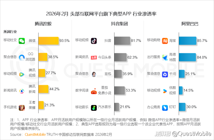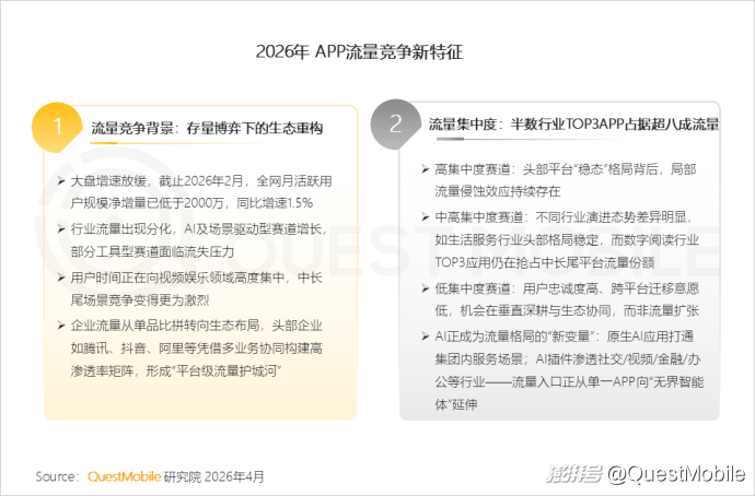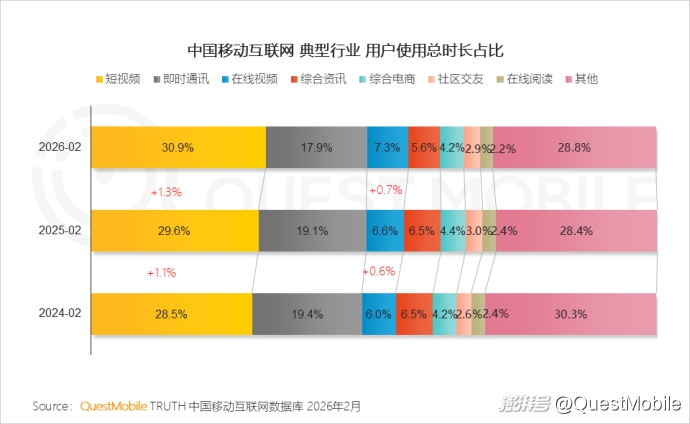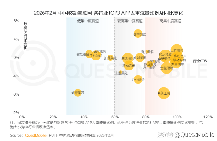 QuestMobile数据显示,2026年2月中国移动互联网一半行业TOP3 APP的去重流量占该行业总流量超八成比例。