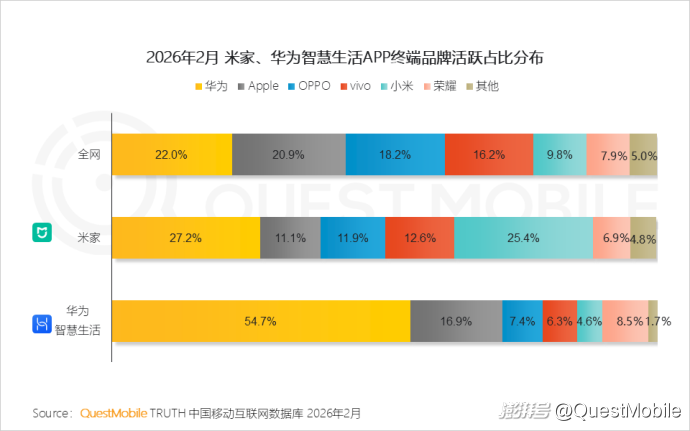 3.2 以硬件占有构筑软件护城河:米家APP中小米终端品牌活跃占比达25.4%,华为智慧生活APP中华为终端品牌活跃占比达54.7%