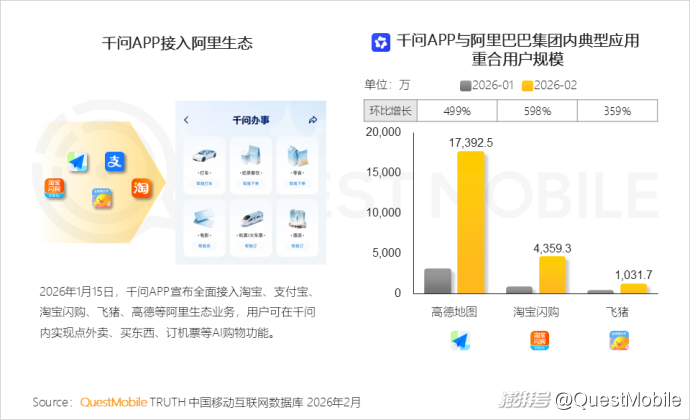QuestMobile数据显示,千问APP宣布接入阿里生态次月,与高德地图、淘宝闪购、飞猪APP重合用户规模分别环比提升499%、598%和359%。
