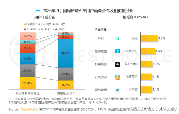 QuestMobile数据显示,圆周旅迹25-35岁用户占比达72.1%,较行业平均高出30.2%;与点点(小红书旗下 AI APP)、十六番旅行、DJI Mimo等APP相似度较高。