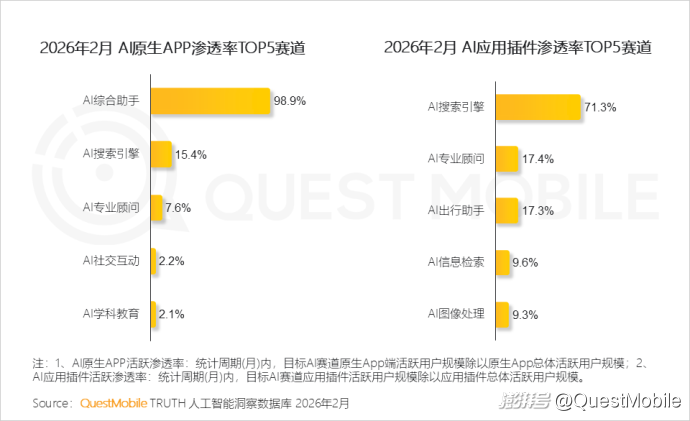 3、AI正成为流量格局的“新变量”:原生AI应用中综合助手渗透率超98%,插件式AI在搜索引擎、专业顾问等领域加速普及,驱动用户行为重构
