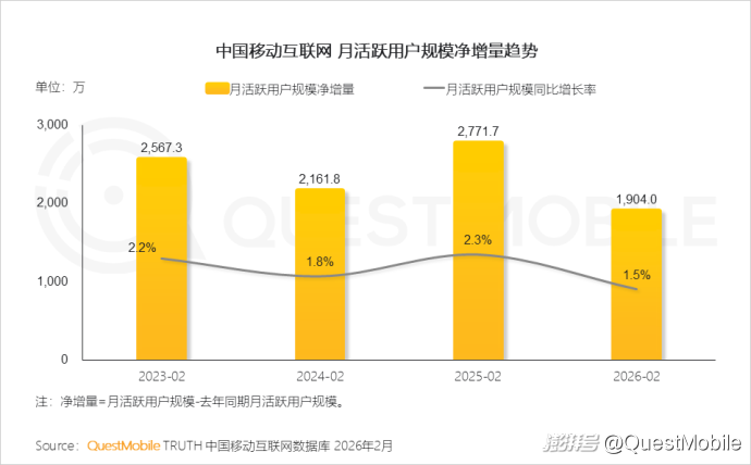 1、移动互联网整体流量增速放缓,截止2026年2月,月活跃用户规模净增量已低于2000万,同比增速1.5%
