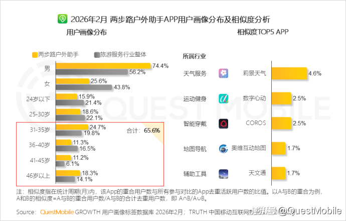 1.6 两步路户外助手以男性为主、31-35岁为核心,聚焦专业级户外运动人群的工具型APP,实现中长尾赛道突围