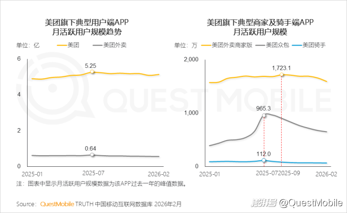 美团生态的流量峰值并非由单一端口驱动,而是呈现出用户、商家、骑手三方协同共振的增长模式, QuestMobile数据显示,2025年7月,美团APP月活达到5.25亿,美团外卖、美团众包及美团骑手APP也同步迎来活跃高峰,美团外卖商家版APP在9月达到1723.1万,显示平台服务链条全面激活。
