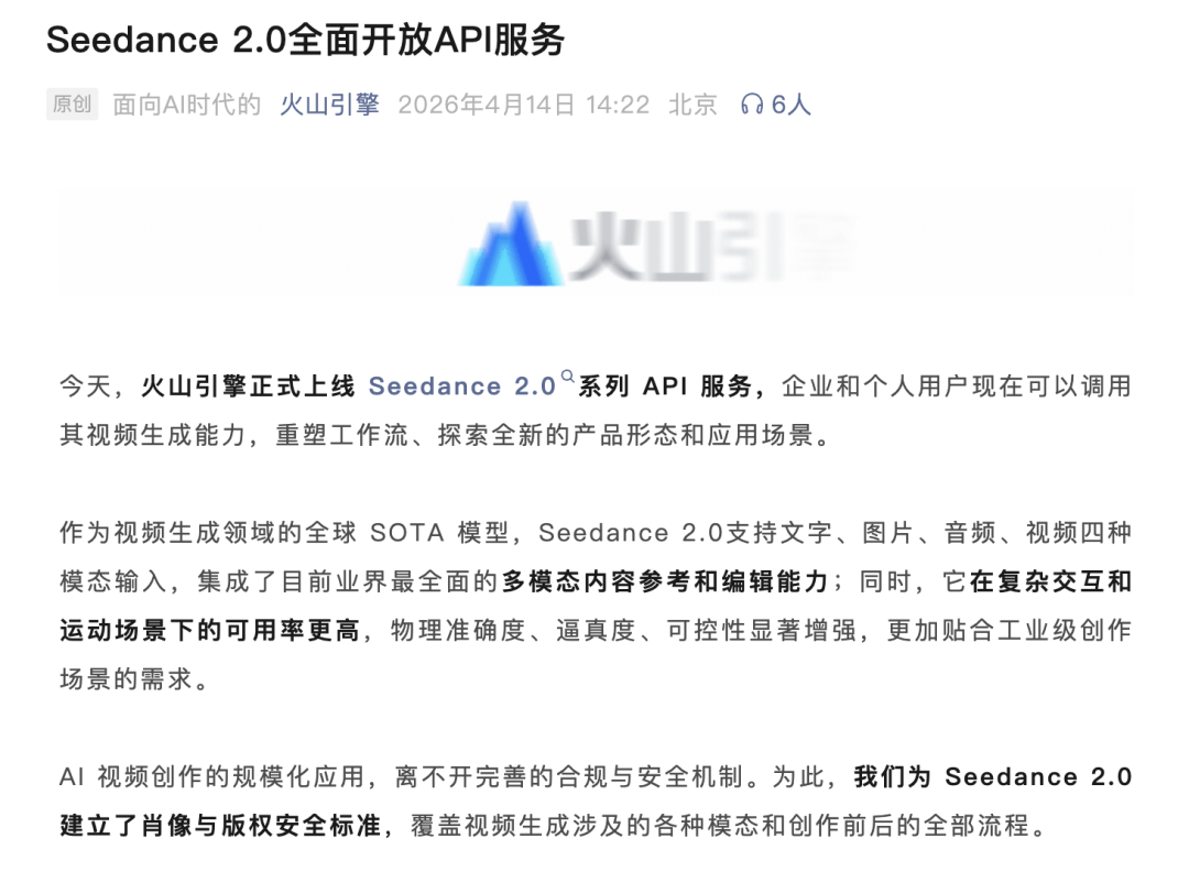 4月14号下午,火山引擎官方宣布:正式上线Seedance 2.0系列API服务,企业和个人用户现在可以调用其视频生成能力。