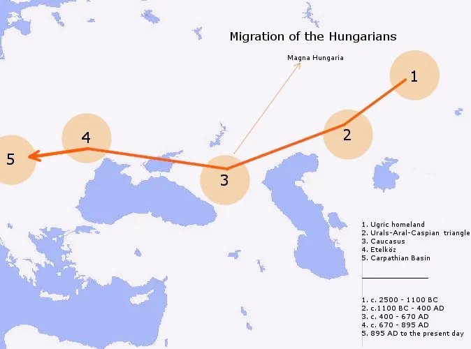 ▲马扎尔人(匈牙利人祖先)迁居路线。3为劫掠欧洲之前的位置