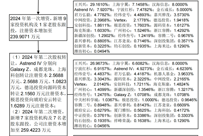 有意思的是,美团的部分持股来自于雷军的转让。宇树招股书中显示,在2024年第二次股权转让中,雷军名下顺为资本关联公司Astrend IV,将部分注册资本转让给了Galaxy Z和成都龙珠。这一轮股权转让和增资后,Galaxy Z持股1.0708%,成都龙珠持股1.0708%。