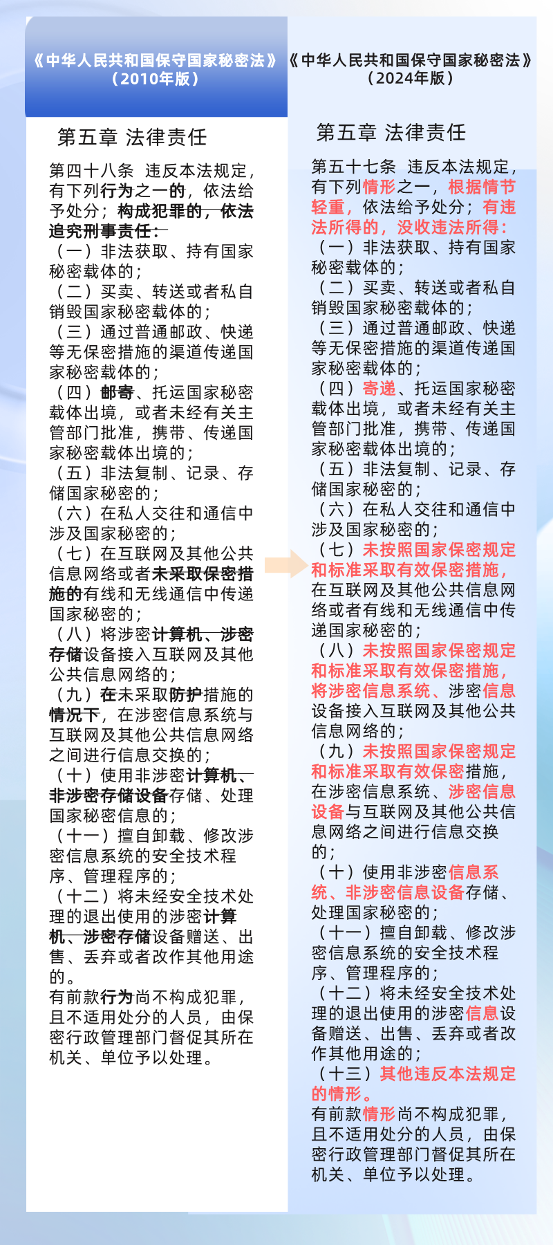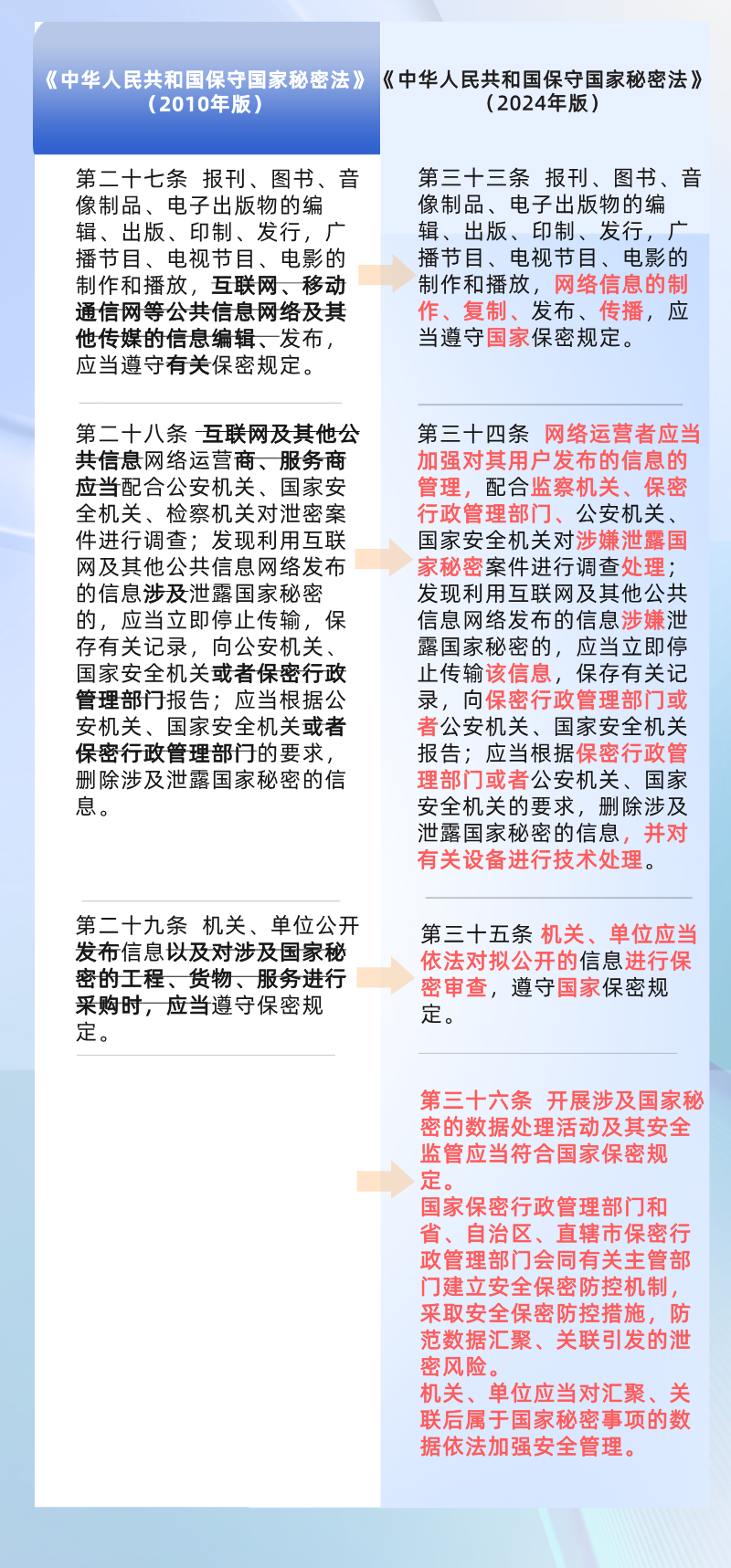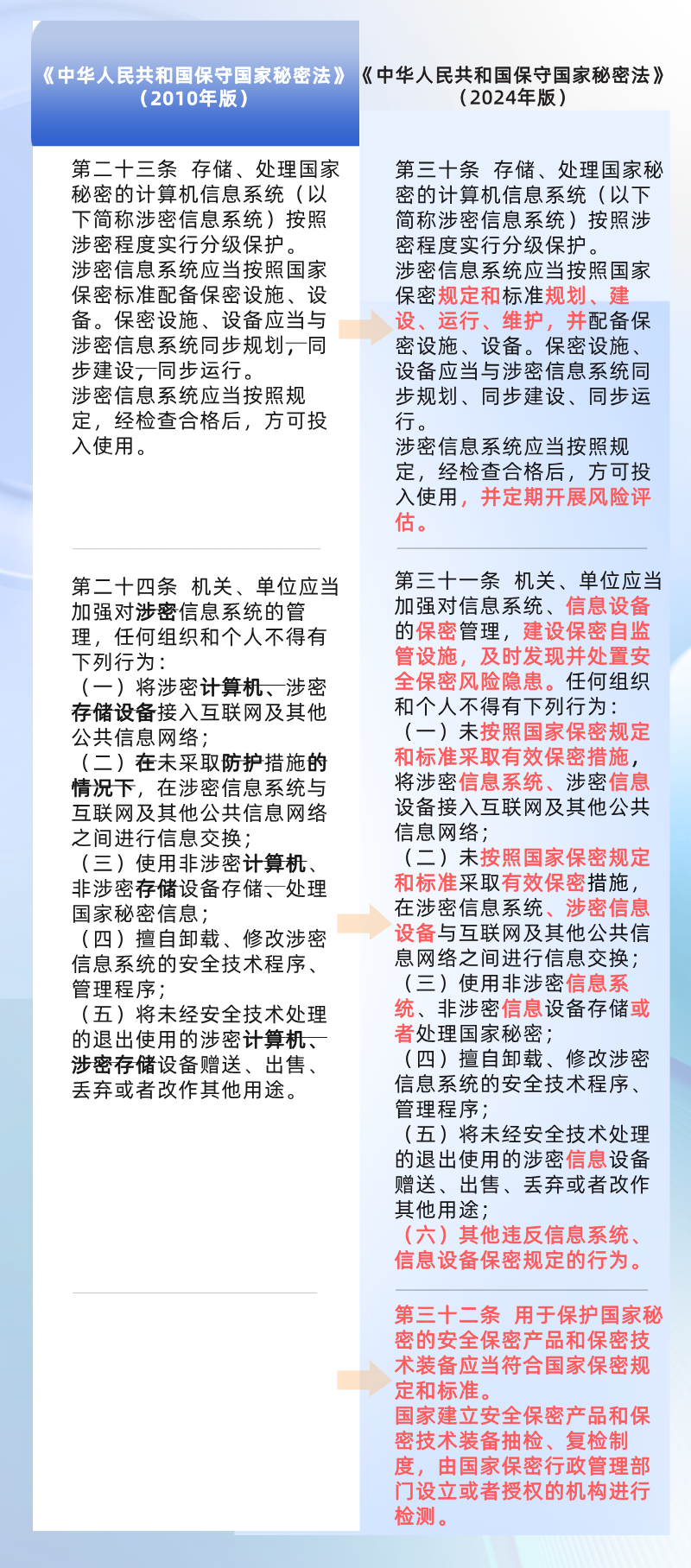 要求对计算机信息系统按照涉密程度不同实行分级保护,强化保密技术设施设备技术防护,并与涉密信息系统同步规划、同步建设、同步运行,明确列举禁止事项,明确网络运营商、服务商的法律责任。