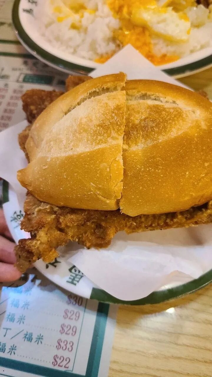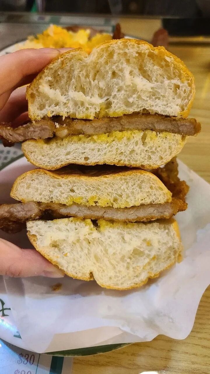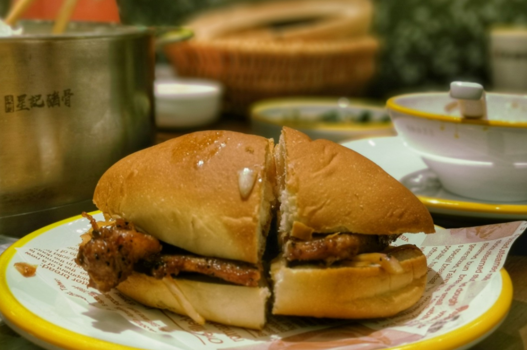 但内里得是一片温柔的心,软和的面包内芯与丰盈的肉汁强强联手,让咀嚼变得轻松畅快,三两下将猪扒和着面包下肚,打出一个悠长的饱嗝,这是一次中西烹饪灵感的完美碰撞。