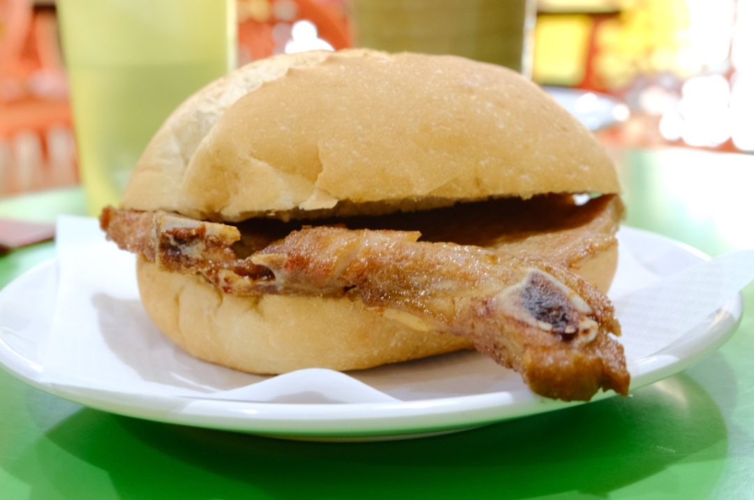 新鲜出炉的猪仔包打横剖开,夹入高温油炸后的猪扒,也有店家会点缀一两片番茄,一点卷心菜,但更多是肉扒与面包之间的硬碰硬,纯粹至极。