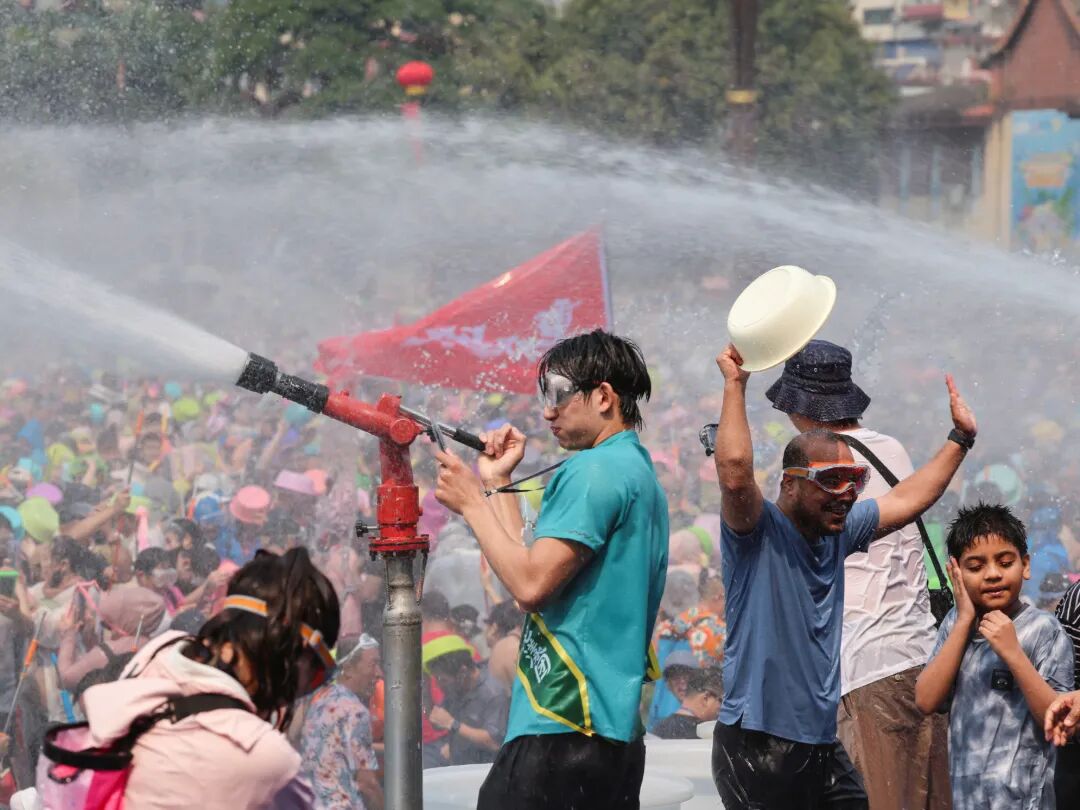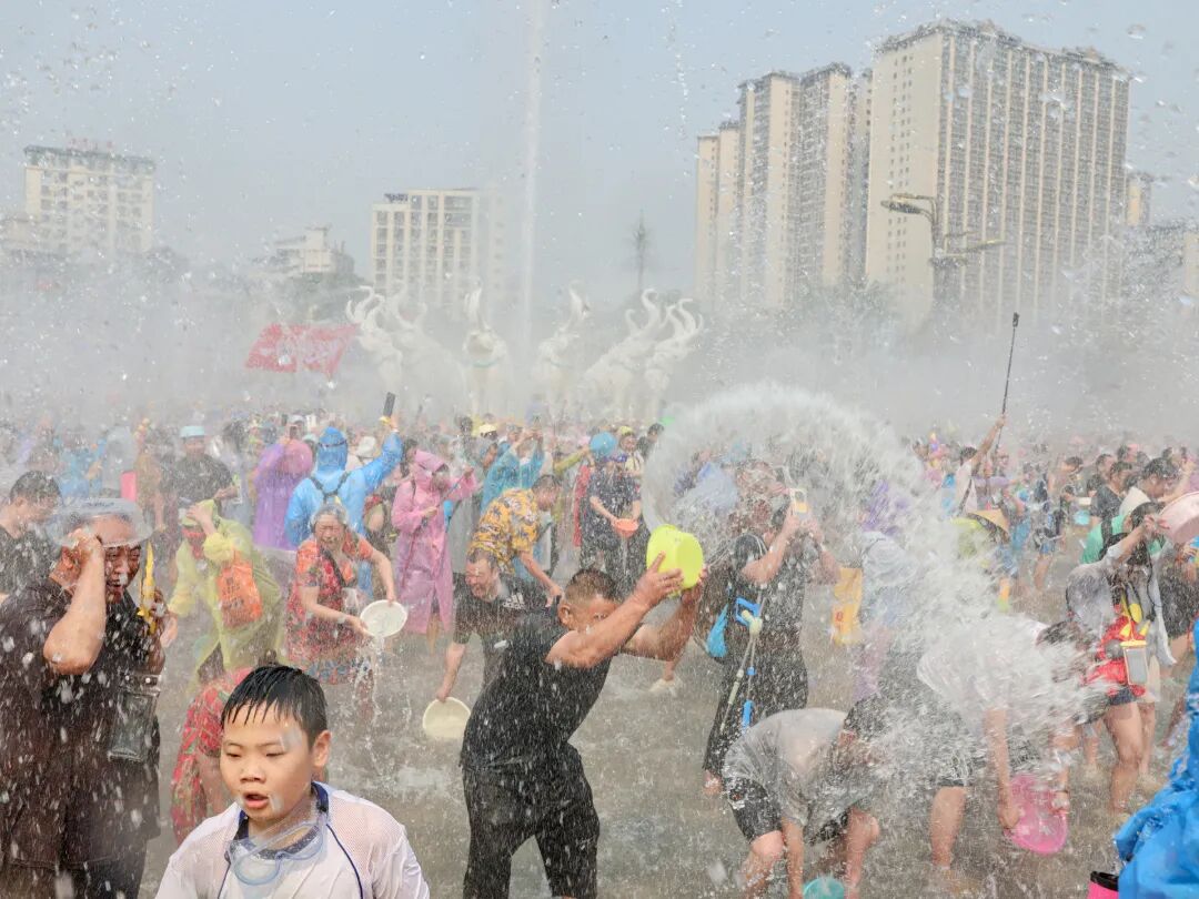 随着泼水狂欢正式启幕,泼水广场瞬间化作欢乐的海洋,人潮如织,水花漫天,欢呼声、笑声、鼓点声交织成一片,响彻云霄。广场中央数十米高的水柱凌空而起,将现场气氛推向最高潮。四面八方赶来的市民、游客欢聚一堂,和着激昂欢快的旋律,在一声声“水、水、水”的呐喊中尽情狂欢。一盆盆象征吉祥、圣洁的祝福之水凌空泼洒,带着最真挚的祈愿,洒向每一张笑脸,祝福每一个人平安顺遂、幸福吉祥。