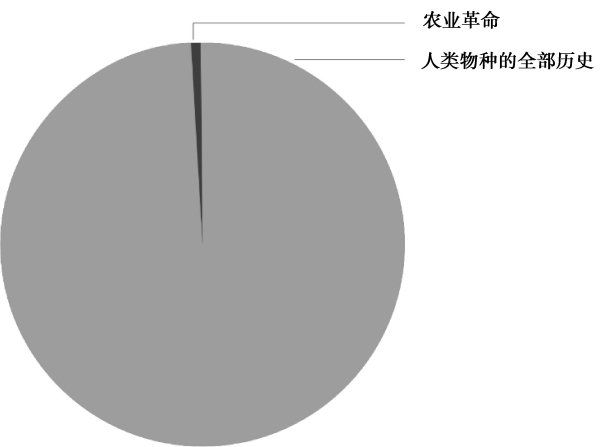 在这张饼状图中,都市革命和工业革命都已被计算在内,但它们的规模相对于人类物种的历史而言实在太小, 以至于无法显示