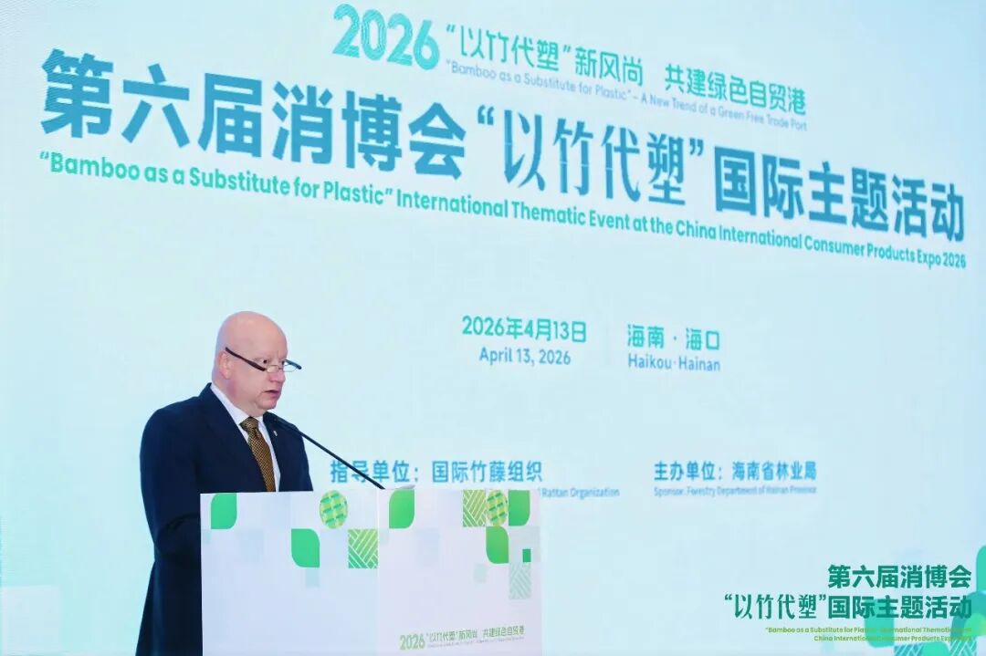 2026年4月13日,由国际竹藤组织指导、海南省林业局主办的第六届中国国际消费品博览会“以竹代塑新风尚,共建绿色自贸港”国际主题活动在海口市成功举办。活动汇聚了国际竹藤组织成员国驻华大使、国家林业和草原局领导、海南省领导,以及中国竹产区政府代表、科研机构及企业代表等100余位嘉宾,围绕政策、产业、技术与国际合作深入交流,共谋竹产业绿色未来,助力全球塑料污染治理。