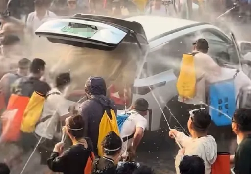 原标题:《泼水节一新能源车车门及后备厢被强行拉开,多人向车内喷水,车内部冒烟……》