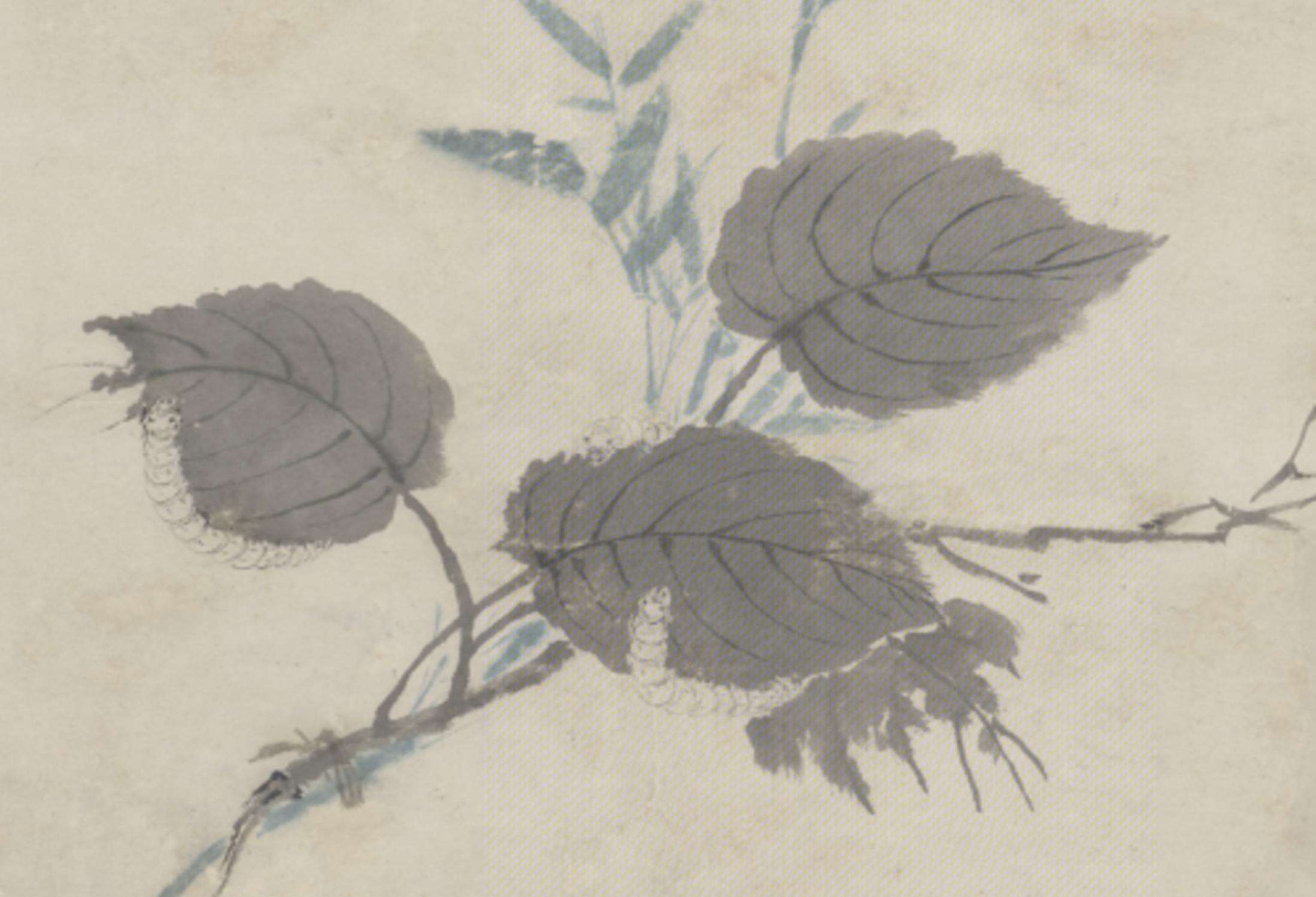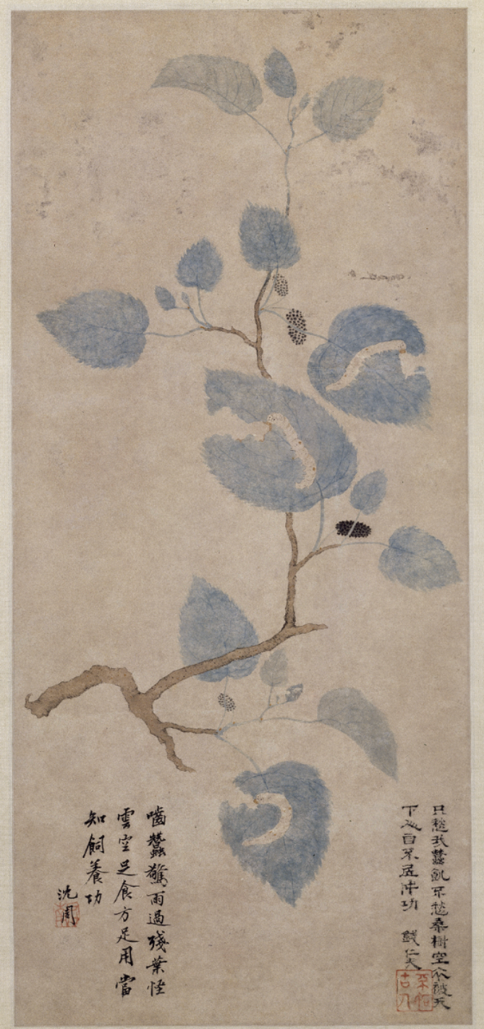 明代吴门画家孙艾(字世节,号西川翁,沈周的门生与至交)曾用花青色绘制了一幅蚕桑图,三条白蚕正啃食桑叶,叶边留下清晰的啃痕,枝头点缀紫黑色桑葚。画面左侧为沈周题诗:“啮蚕惊雨过,残叶怪云空。足食方足用,当知饲养功。”