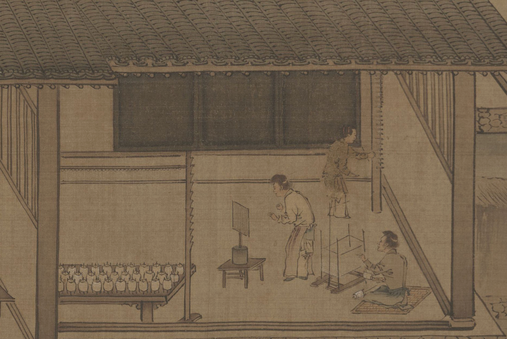 以下这幅《蚕织图卷》据传为南宋画作,虽然对于此画的断代真假存疑,但这一长卷记录了蚕织业的生产加工过程,是生动的市井缩影。