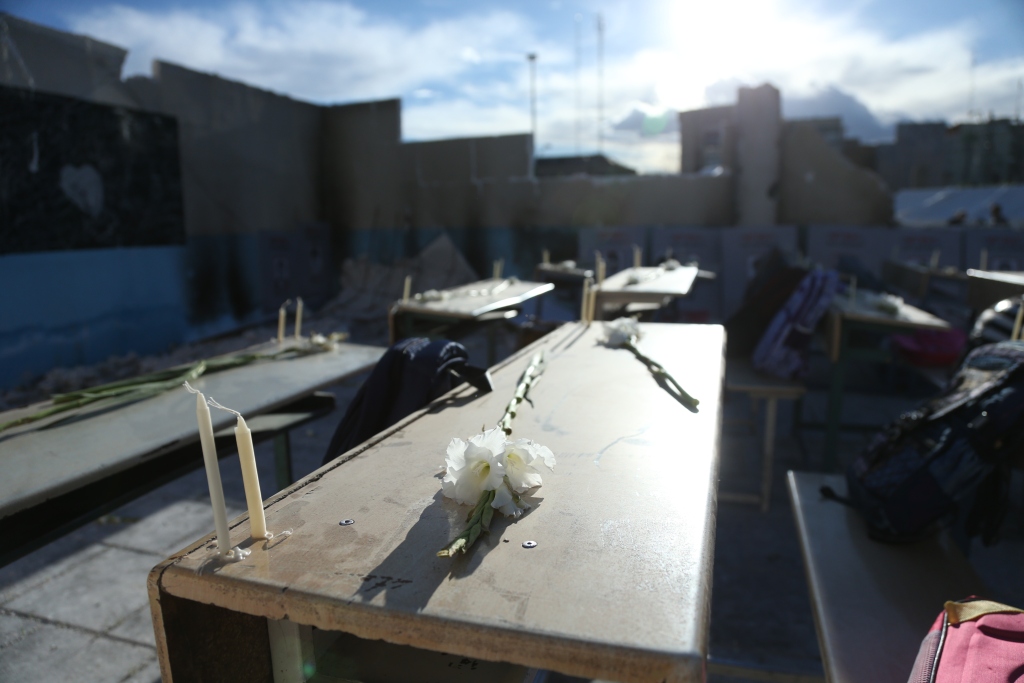 4月6日,在伊朗首都德黑兰市举行的悼念活动现场,组织者搭建起小学教室遭袭场景并在课桌上摆放鲜花,悼念遭美以空袭遇难的米纳卜小学学生。新华社 图