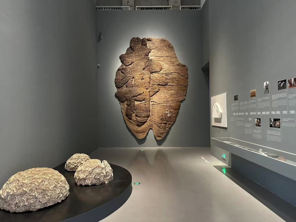 施慧单元“羽石之歌”展览现场,中为《寿》,左为《巢》