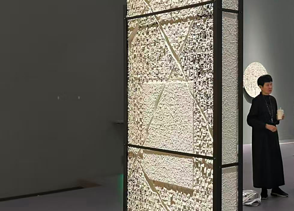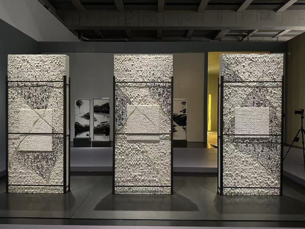 一次在国画系门口,她看到被丢弃的宣纸。她将这些废弃材料带回工作室,尝试编织。结果出乎意料,宣纸的编织“自带一种中国文化的气息”。随后,她前往富阳考察传统造纸工艺,并开始使用纸浆进行创作。纸浆覆盖在纤维结构上,会在干燥后留下线的痕迹,这种痕迹既微妙又内敛。正是这种“痕迹”,让她逐渐找到了自己的语言。