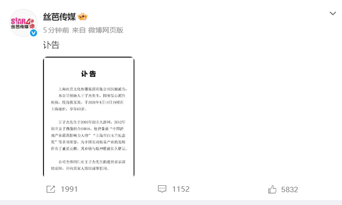 刚刚,丝芭传媒发讣告:本公司创始人王子杰先生,因突发心源性疾病,经抢救无效,于2026年4月14日19时在上海逝世,享年63岁。