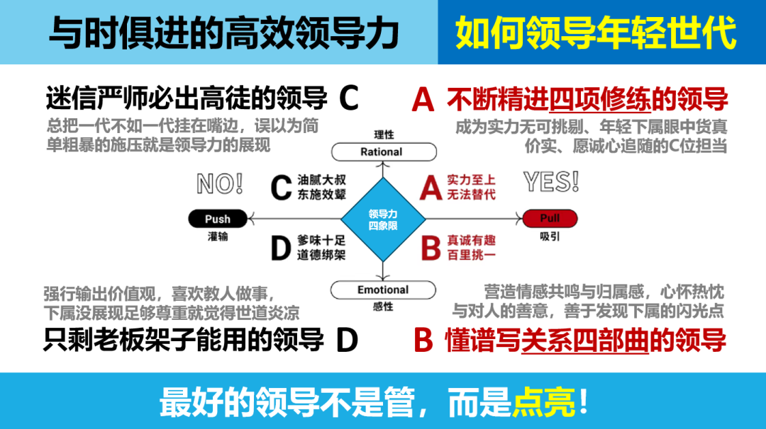 总之,老登不必全盘否定过往。在增量市场中磨砺出的敏锐、直觉与执行力,依然是宝贵财富。但时代已给出新的命题:从“推”到“拉”,从“管控”到“点亮”。主动修炼,向A象限(实力导师型)靠拢,或先稳固B象限(情感连接型),都是切实可行的第二曲线。抓住这个窗口,不仅能跨越代际鸿沟,更有机会与年轻一代共同塑造适应未来的组织形态。