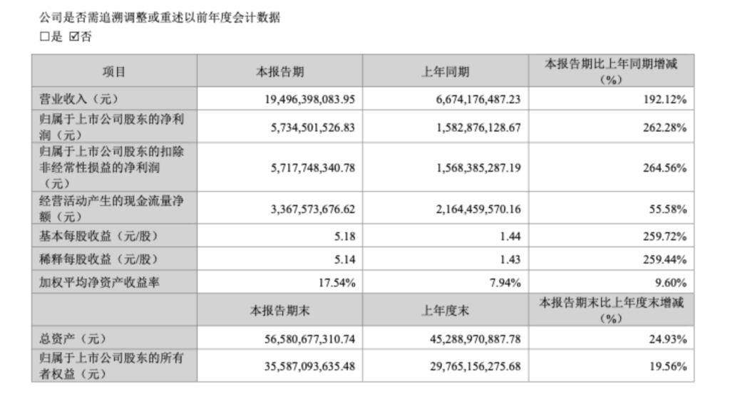 中际旭创单季57.35亿元的归母净利润,已超过2024年全年51.71亿元的归母净利润。